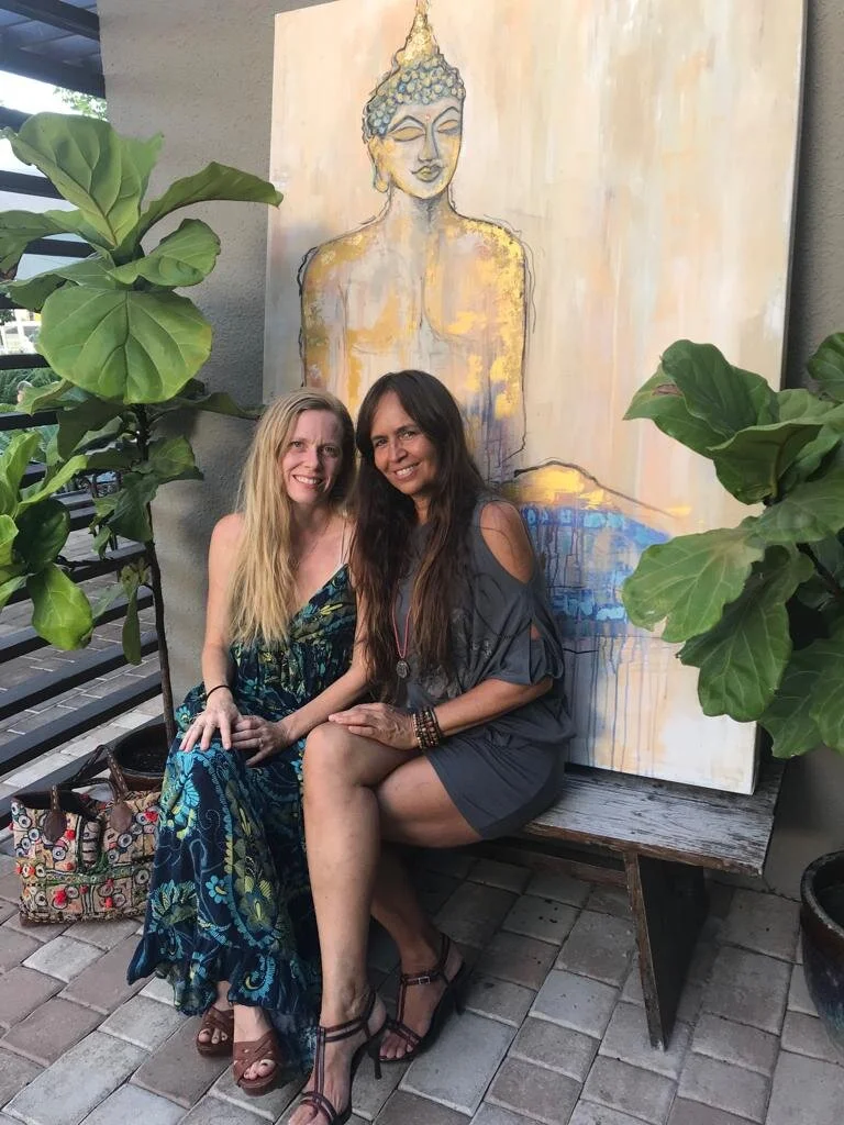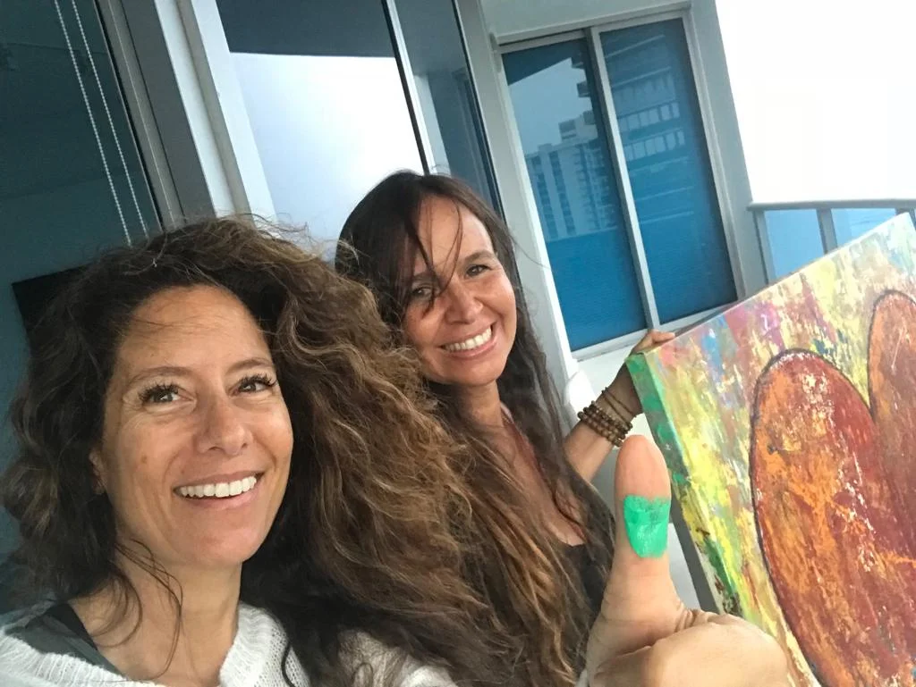 The artist Cristina Dalcomune and her friend near the painting called “Meditation".
